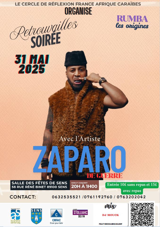 Artiste : ZAPARO DE GUÉRRE Date : 31 mai 2025 Horaires : 20h00 à 01h00 Lieu : Salle des Fêtes de Sens58 rue René Binet89100